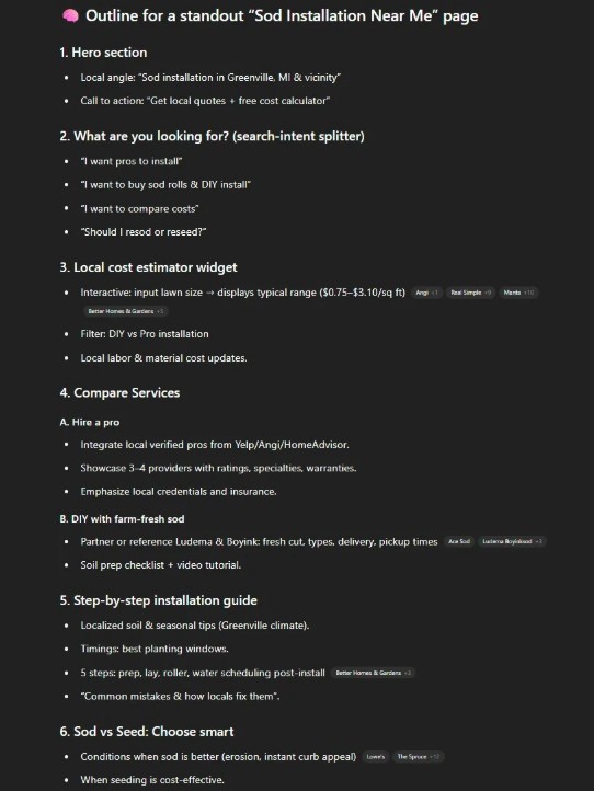 “Create an outline for a page aimed to rank for [KEYWORD], look at the top 5 results in Google to compare. Include and call out ideas, takes, resources that are novel, that no one else has done. Identify any and all intentions that someone might have searching for this keyword.”