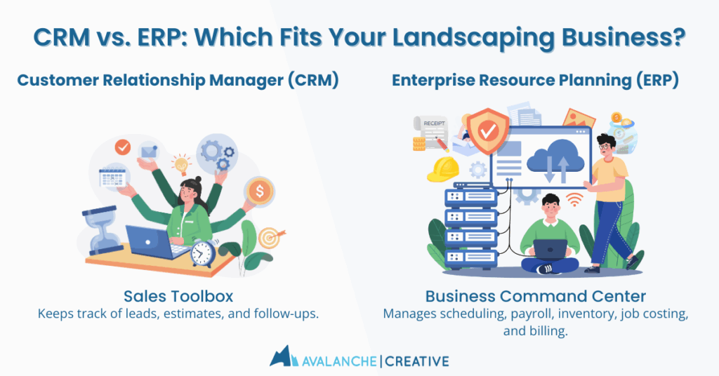 - ERP (Enterprise Resource Planning): An ERP is the all-in-one system that runs your operations. It manages not only customers, but also scheduling, payroll, inventory, job costing, and billing. If you’ve had crews show up at the wrong property or run short on materials mid-job, you’re dealing with ERP-level problems.